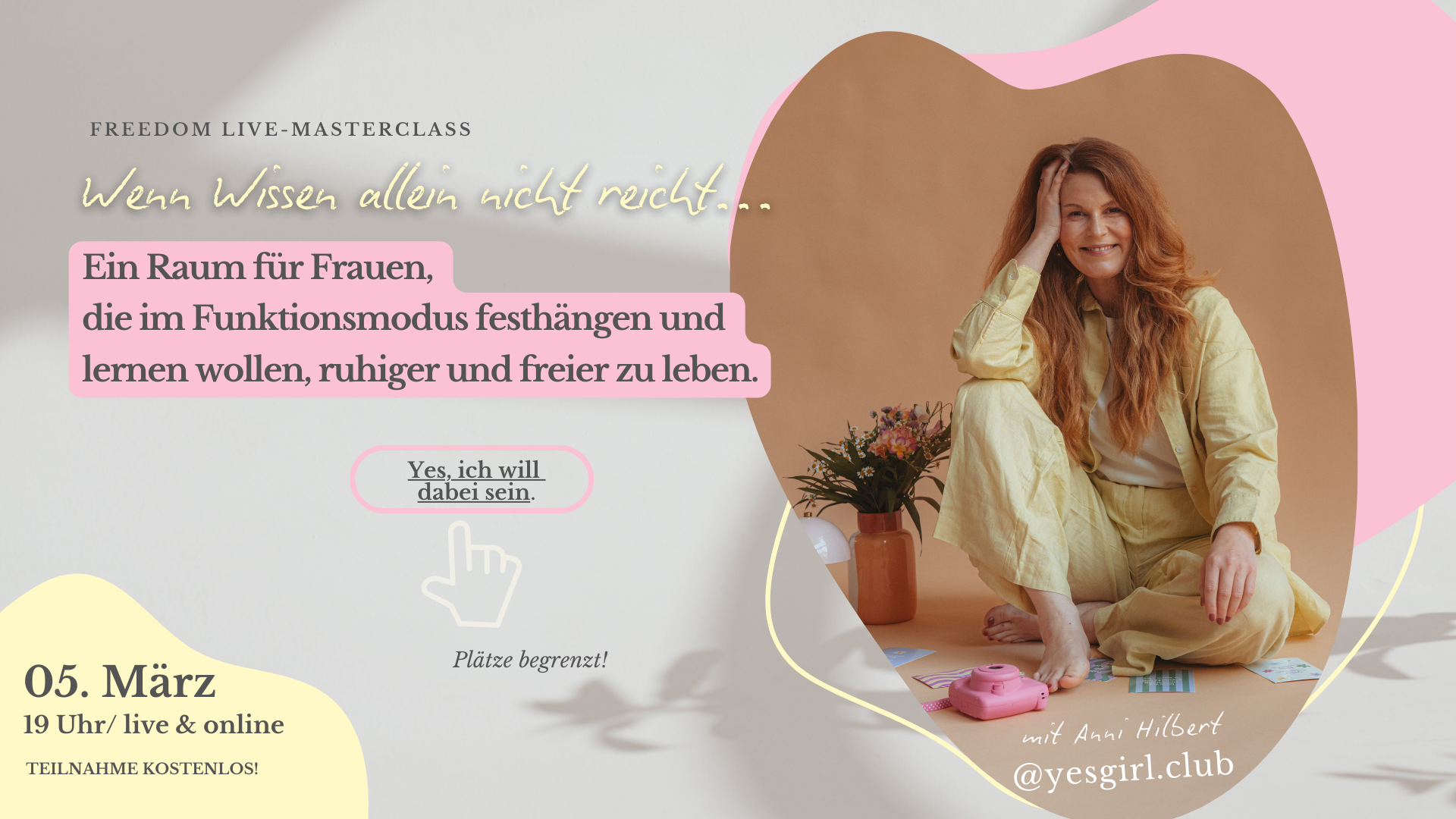 Melde dich hier kostenlos an & sichere dir deinen Platz in meiner Freedom Live-Masterclass am 05. März. Du erhältst alle Infos und den Zugangslink per E-Mail.